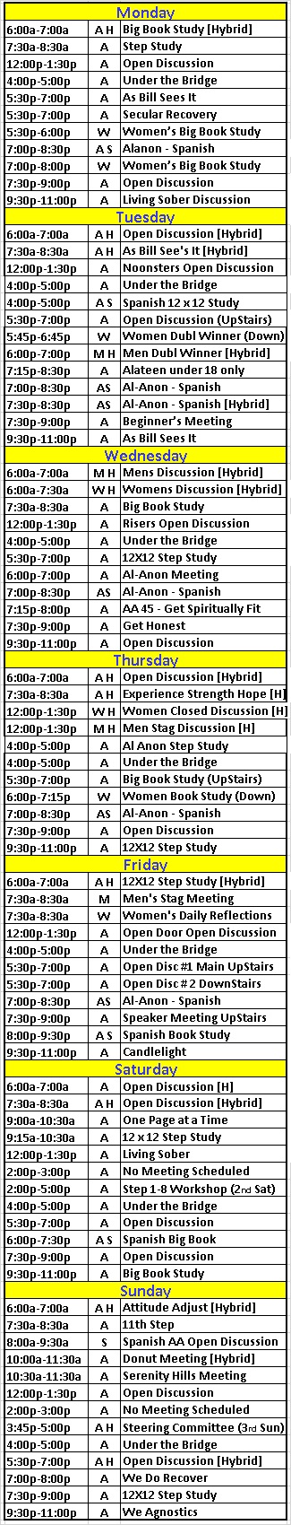 A = Mixed MeetingW = Women OnlyM = Men OnlyH = [Hybrid-Zoom] S = Spanish Please Be Quiet when entering and exiting the property for all tenants.